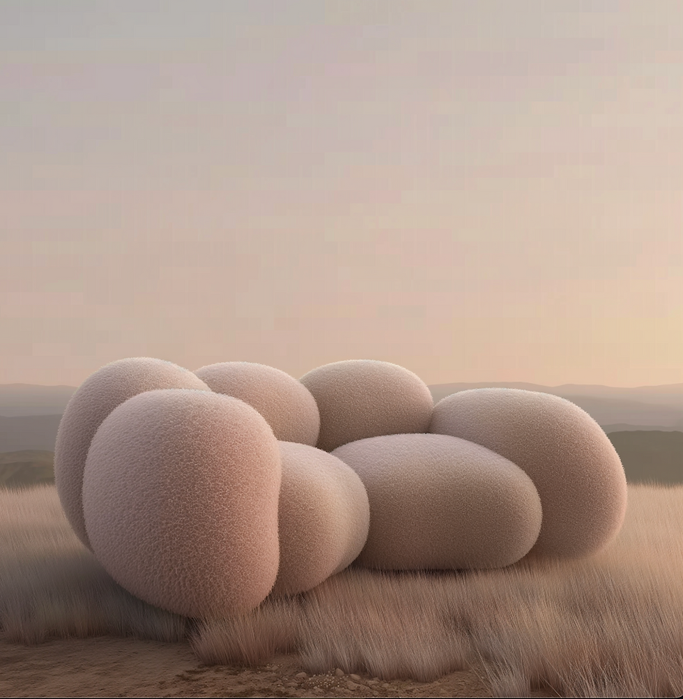 A sofa that incorporates natural shapes and colors combined with soft materials
